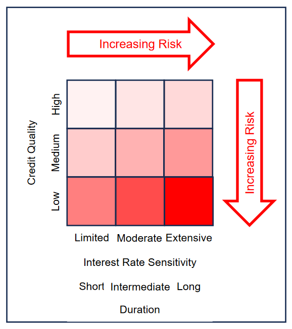 Fixed income: The fixed income (bond) style box categorizes funds by credit quality (high, medium, low) on the vertical axis and interest rate sensitivity (limited, moderate, extensive) as measured by duration (short, intermediate, long) on the horizontal axis.
